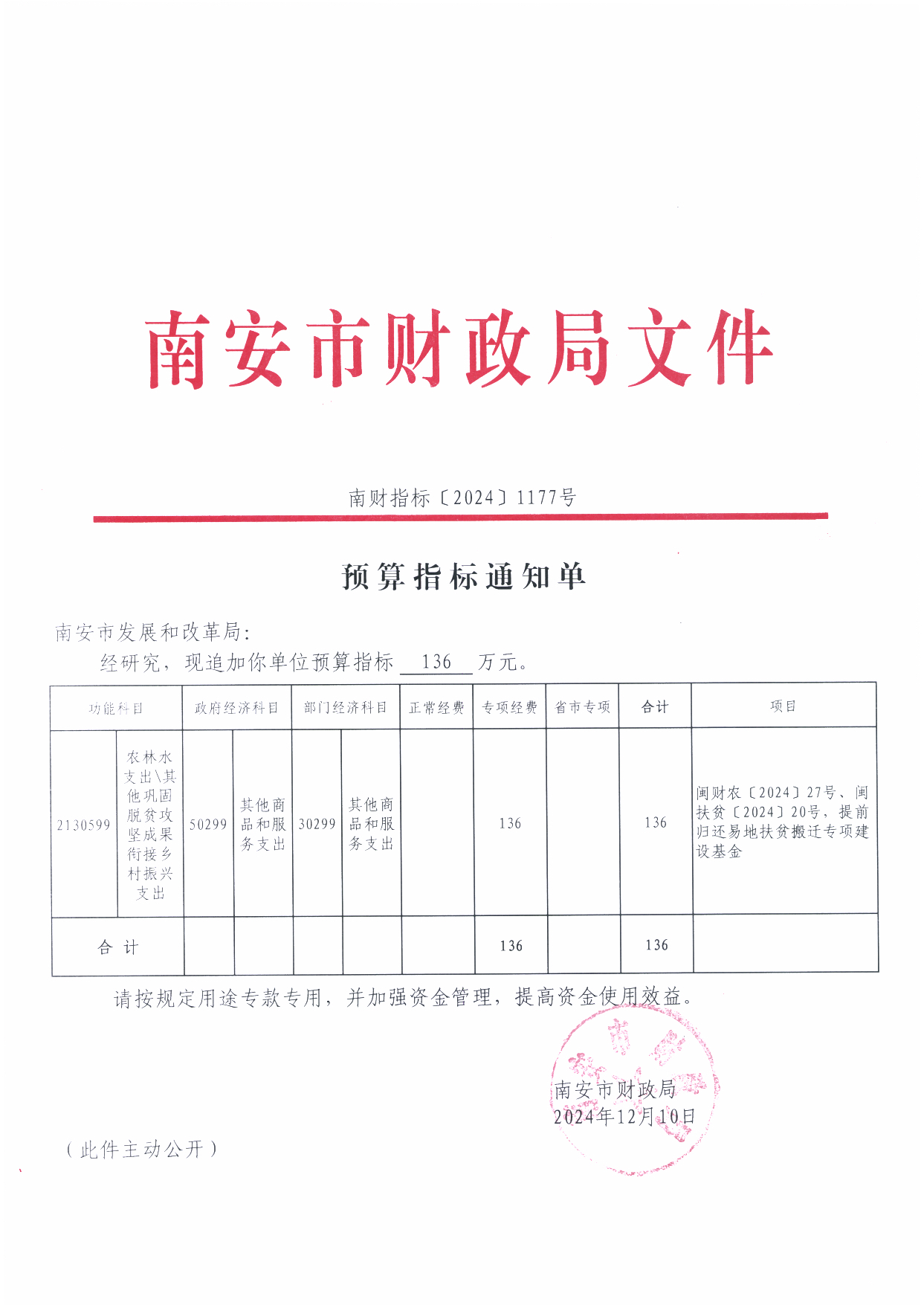 预算指标通知单【南财指标〔2024〕1177号】