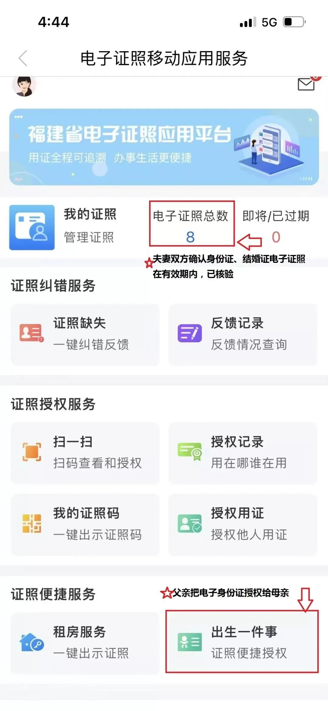 2.产妇电子证照(身份证和结婚证),可先在闽政通APP上查看电子证照是否齐全,如遇不全进行纠错反馈;