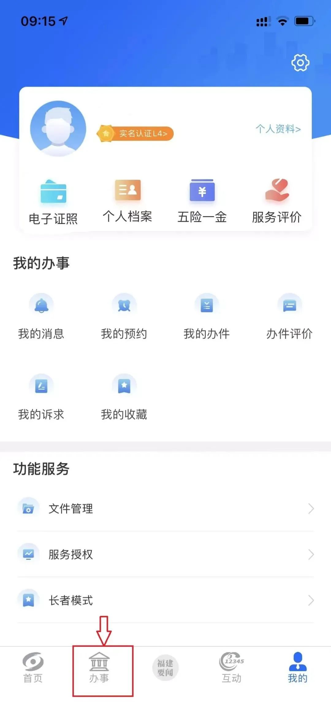 第四步:孩子母亲在闽政通界面下方点击“办事”。
