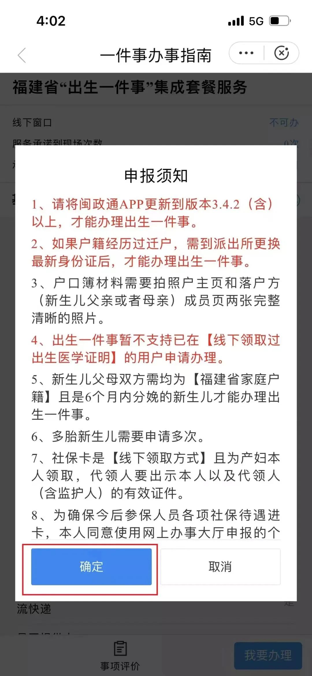 第五步:孩子母亲点击出生一件事,阅读申报须知,点确定进入下一个流程。
