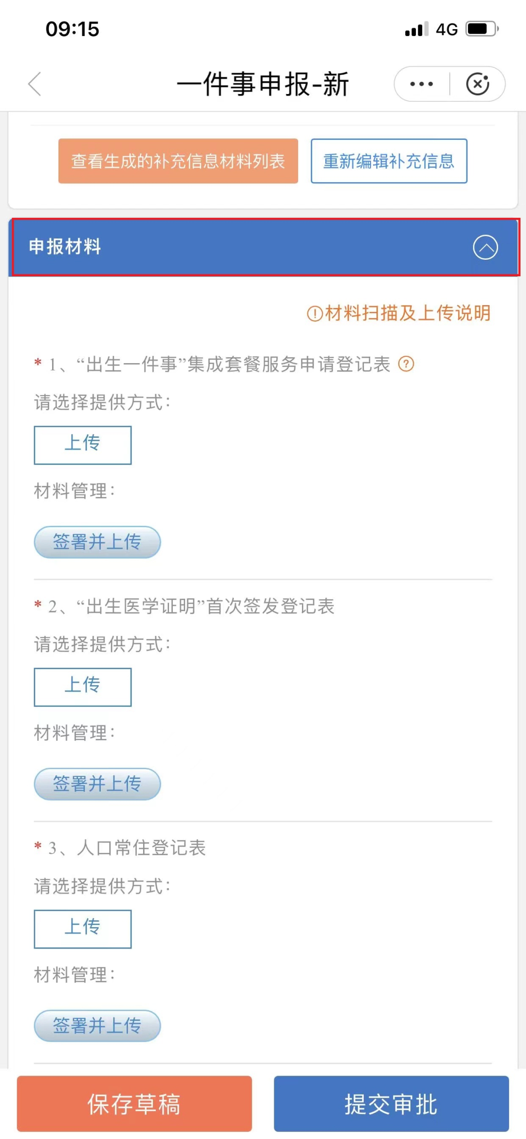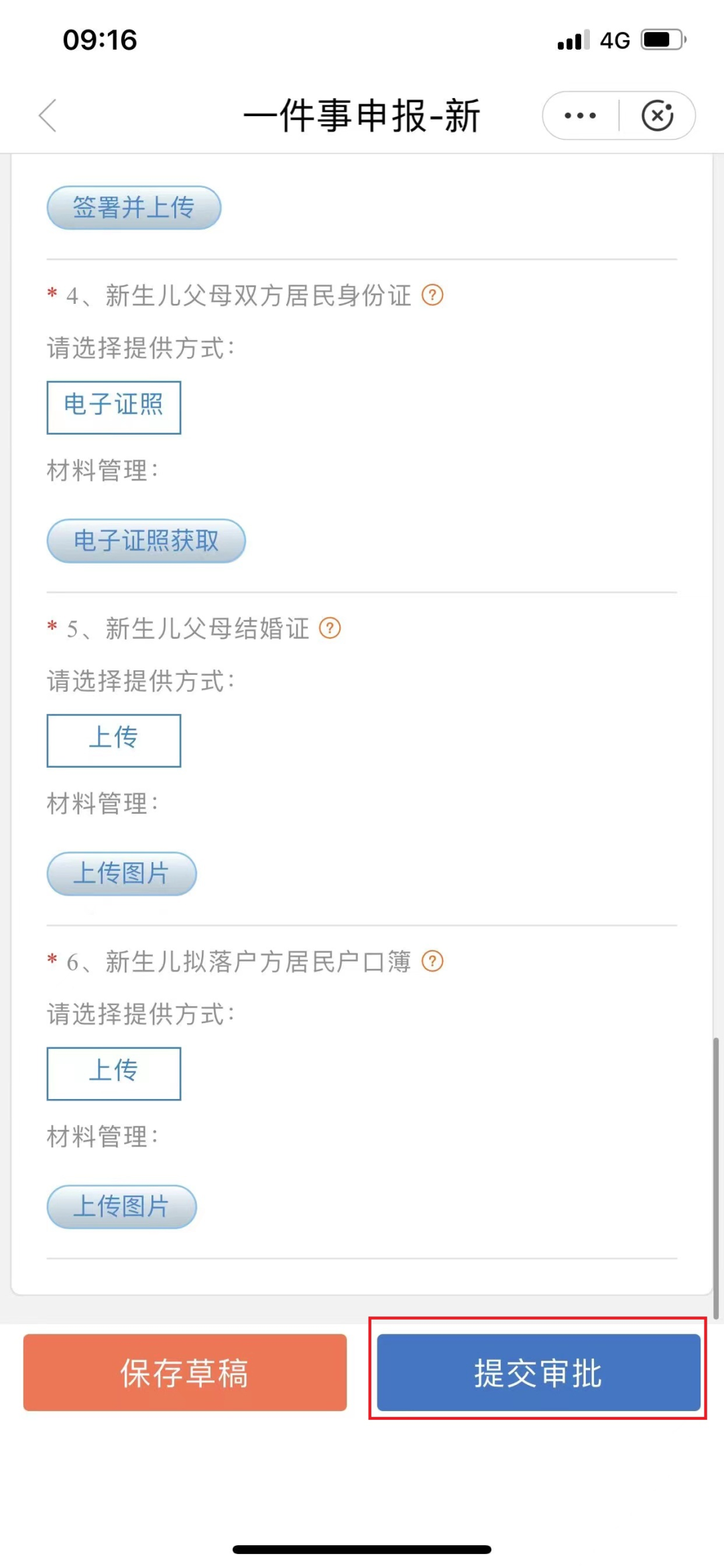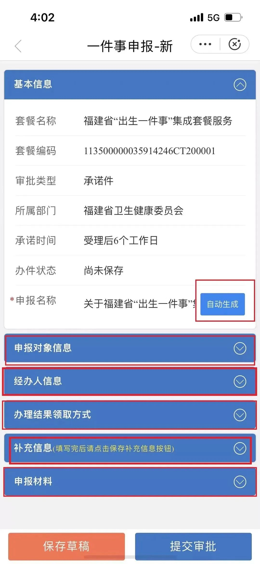 第九步:材料上传完毕,提交审批。在提交这几个表格时如果材料不齐全,可以点击先保存草稿,后面再通过“闽政通APP——办事——我的服务——我的办件”进入继续操作。