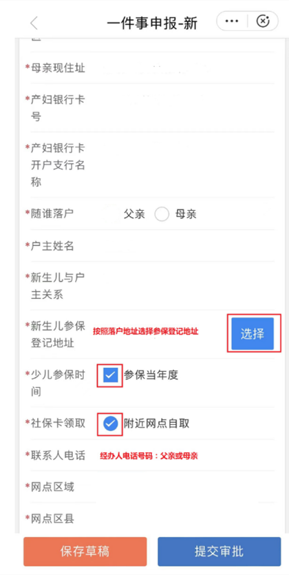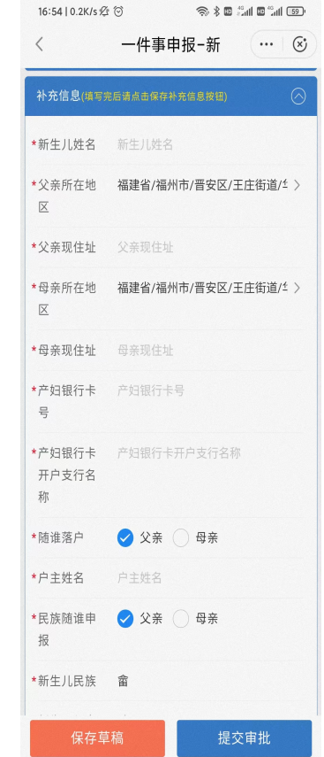 1.父亲/母亲所在地区会默认加载在医院填写的地址,如果有误可以进行修改;