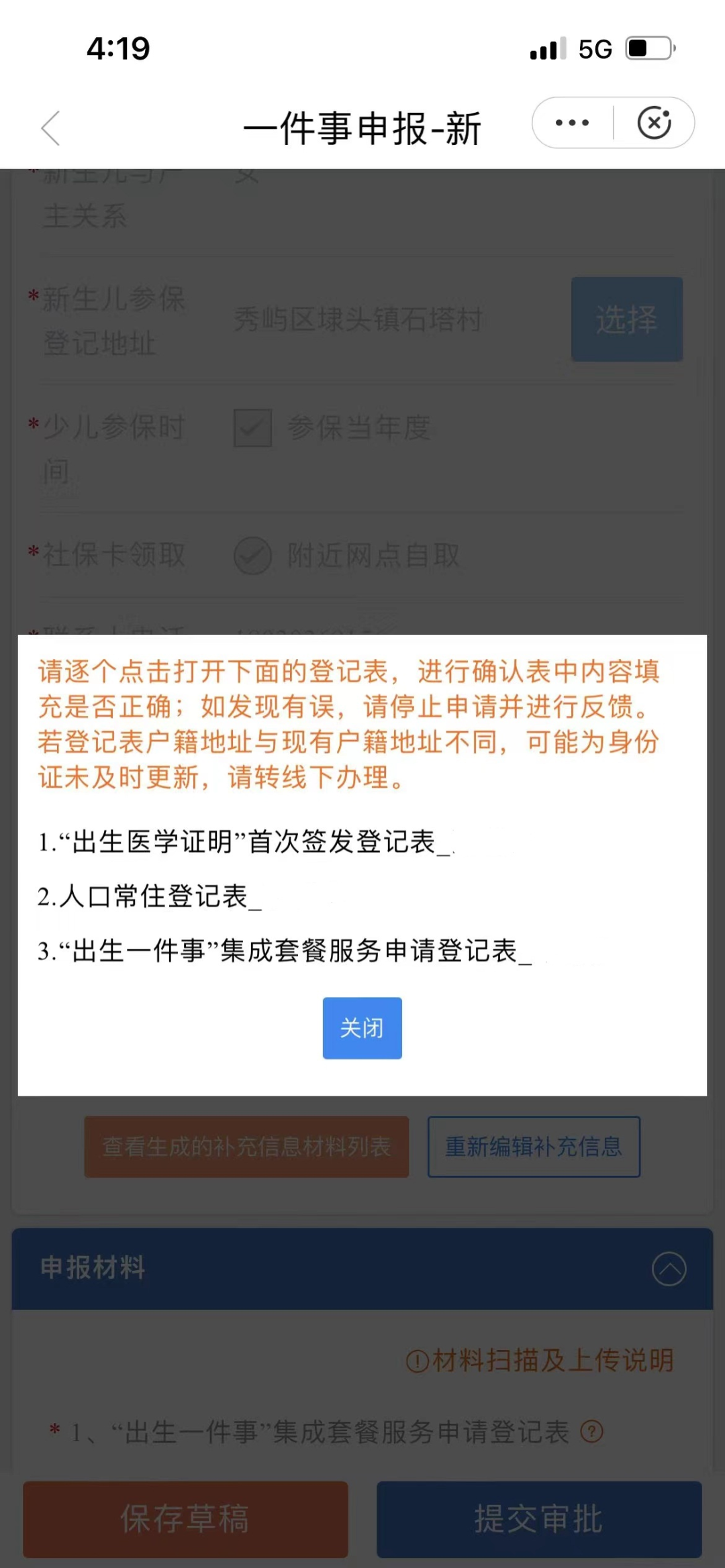 保存成功后出现这个界面,这三个表格可以打开查看以上信息是否正确以及户籍、产妇分娩信息是否正确,有误则需要反馈网上办事大厅,不能继续申请。
