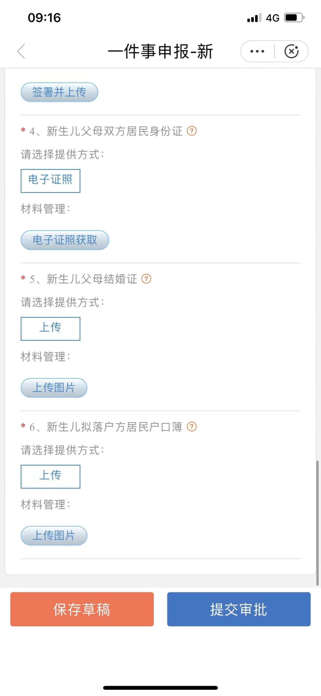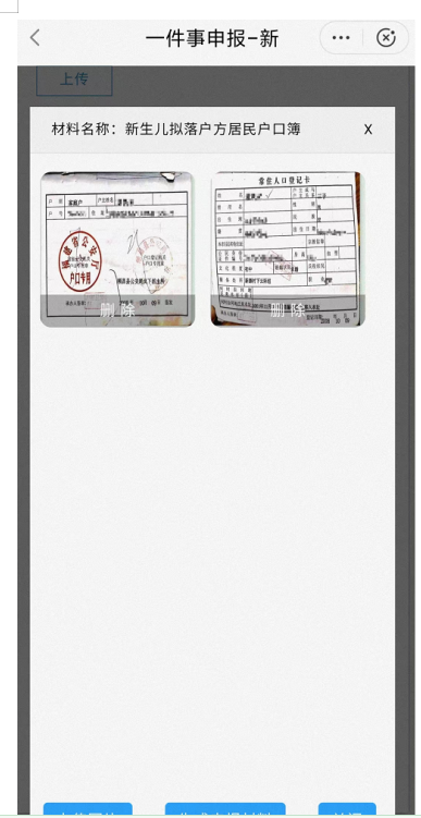 2.如果新生儿父母结婚证是证照方式,则选择母亲证照,选择一个即可。如果是图片方式,则进行拍照父母一方的结婚证即可,最终生成的申报材料只能有一份。