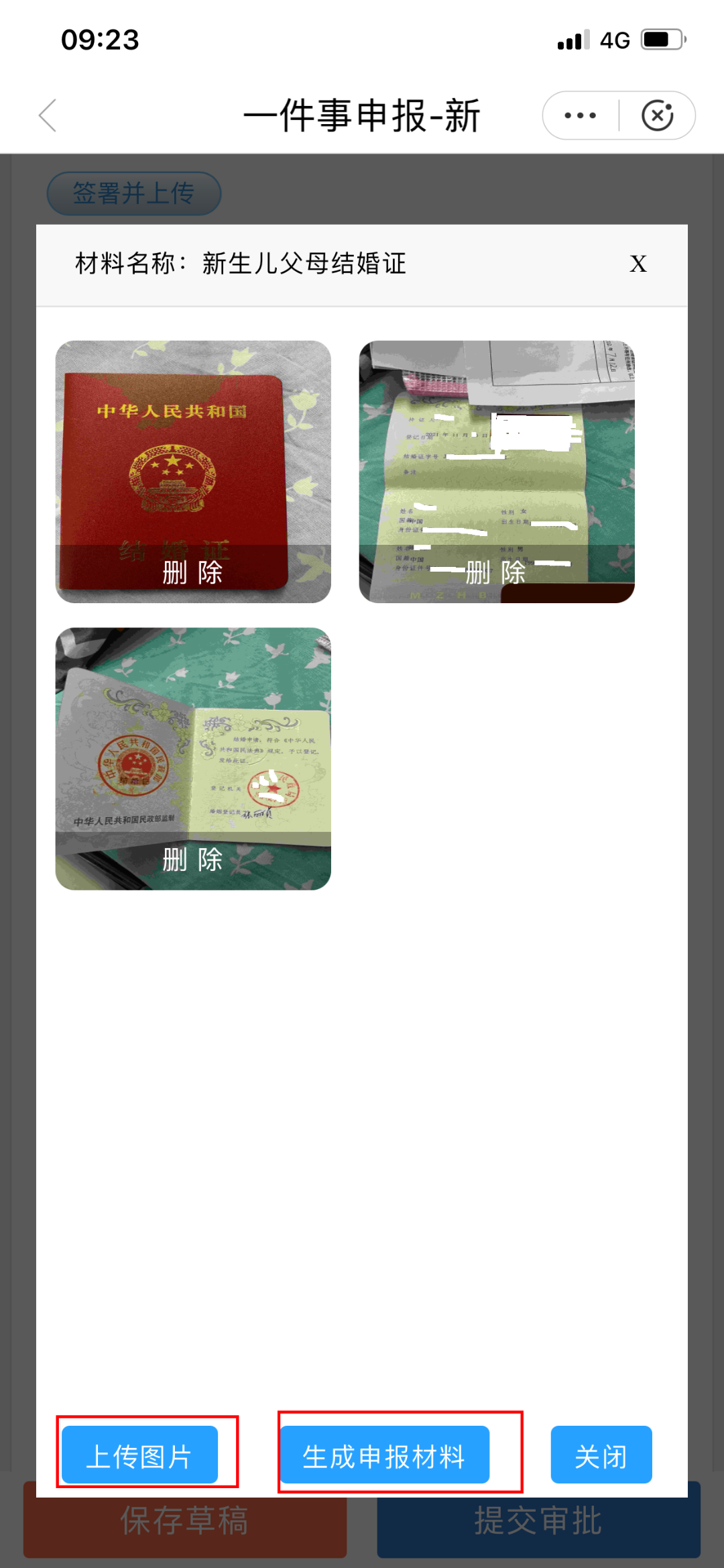 点击上传结婚证的图片,有夫妻头像的那一页即可,生成申报材料,只能点击一次生成一份,多次点击会生成多份。