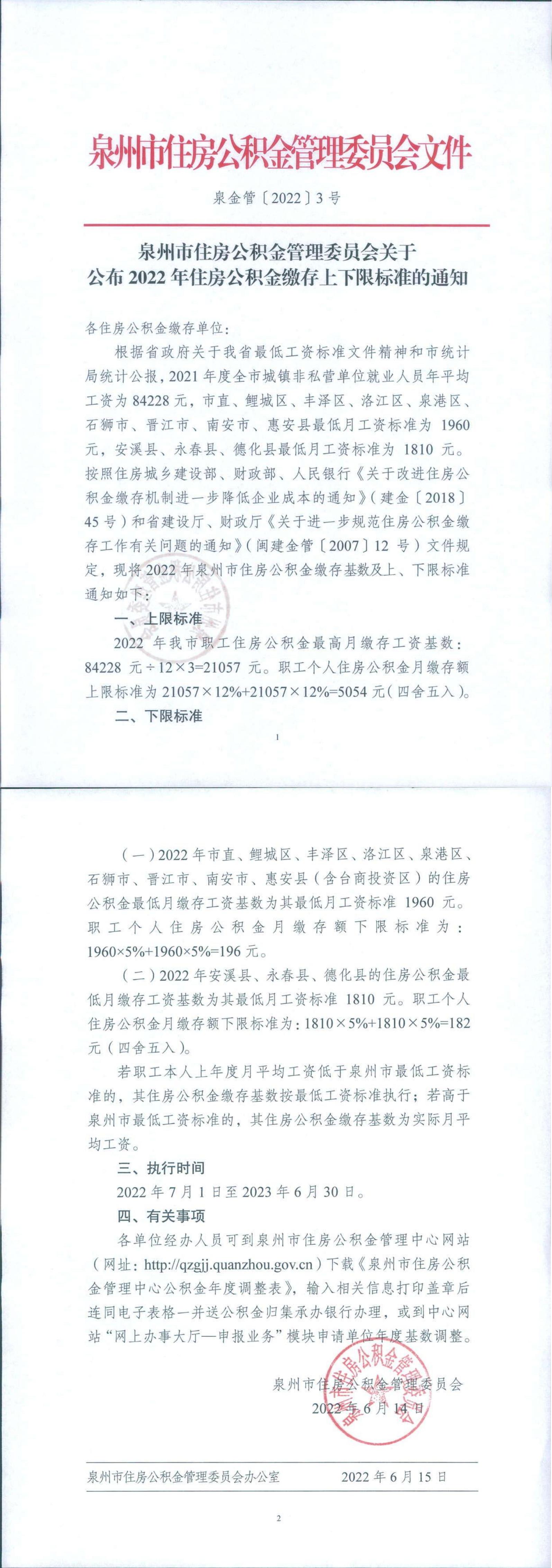 泉州市住房公积金管理委员会关于公布 2022 年住房公积金缴存上下限标准的通知